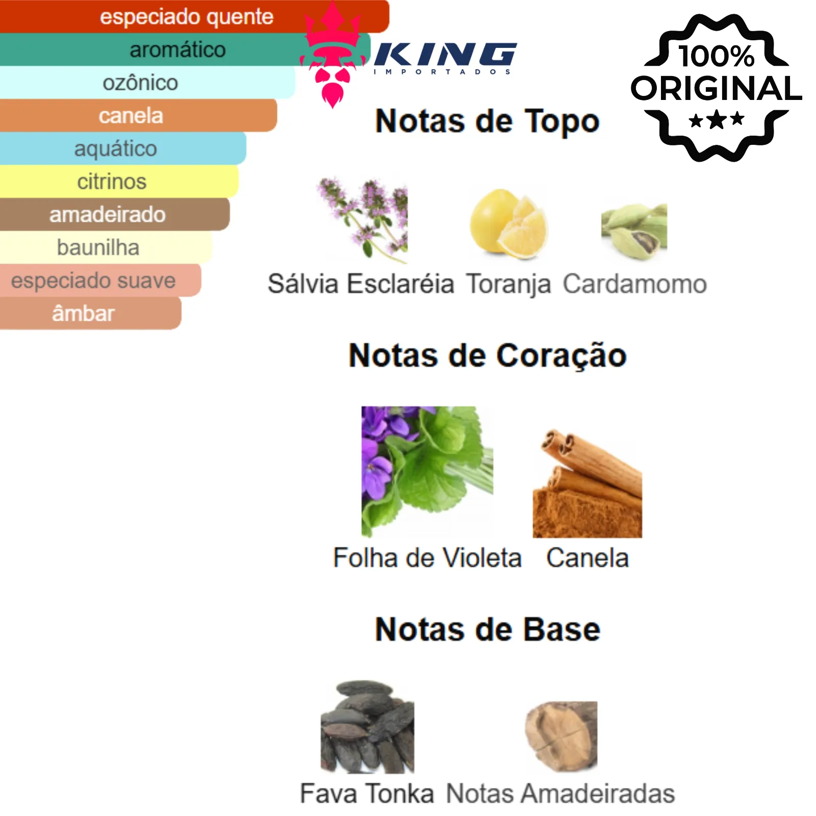 Notas de Coração: 🍃 Folha de Violeta, 🌶️ Canela