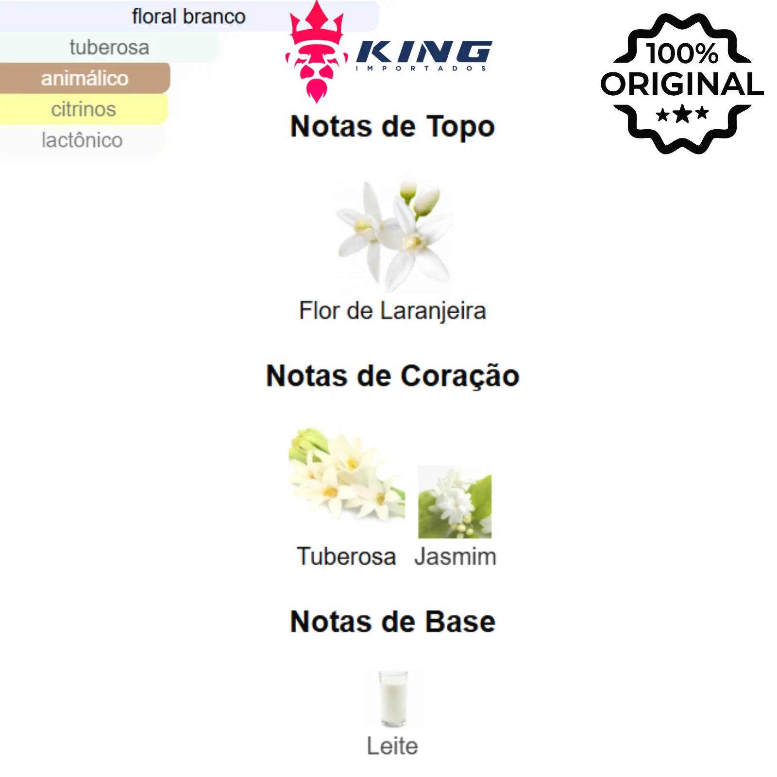 Principais Tipos de Aroma: Floral, Doce, Leitoso, Branco Floral.
