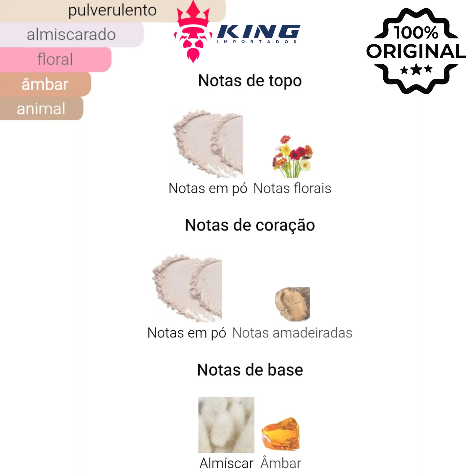 Mais Detalhes sobre a Fragrância: Musk So Poudrée abre com um acorde delicado de notas florais e atalcadas, transmitindo suavidade e requinte. No coração, o toque amadeirado se mistura ao lado atalcado, criando profundidade e conforto. A base finaliza com o calor do âmbar e a maciez do almíscar, resultando em um rastro elegante, limpo e sofisticado.