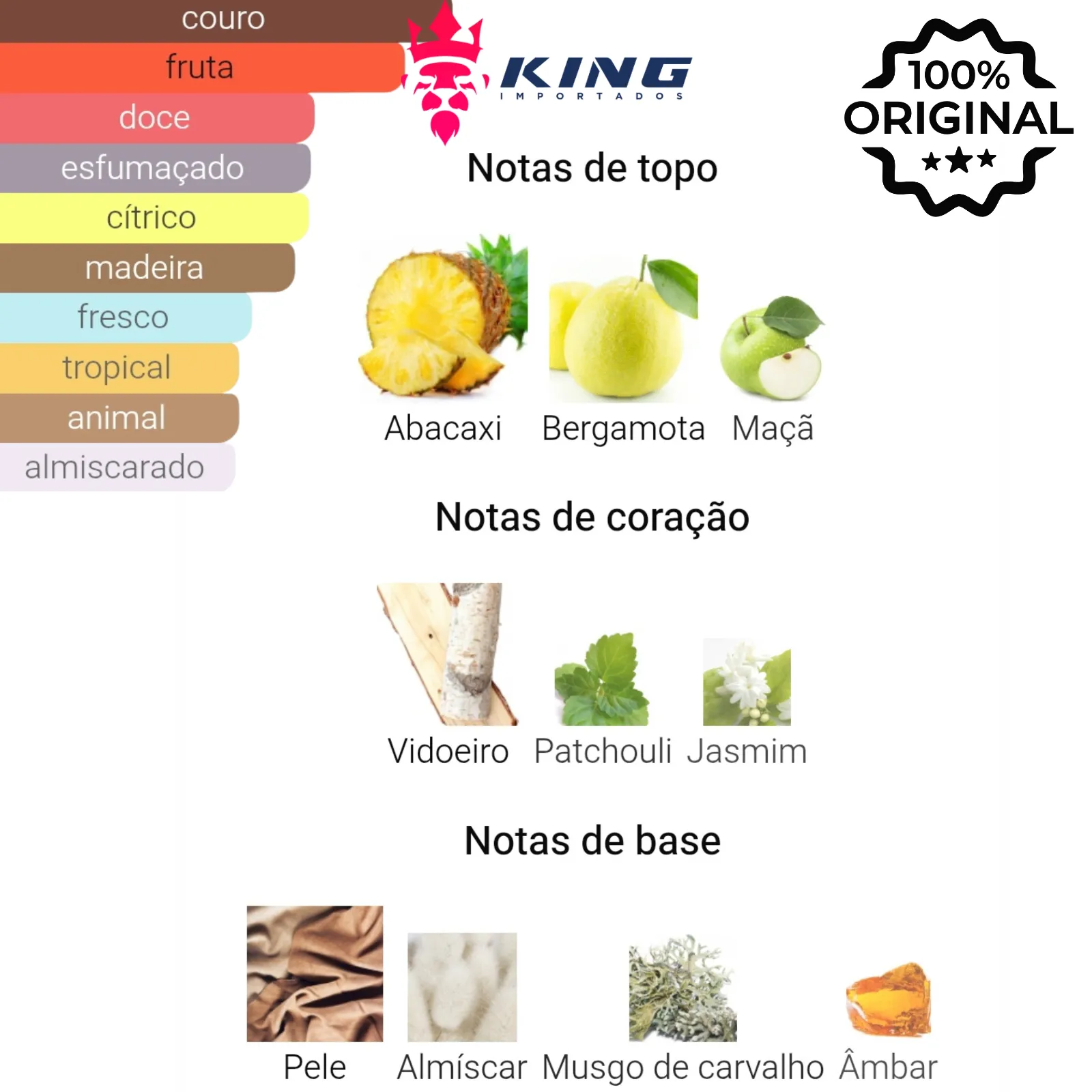Notas de Base: Couro 🖤, Almíscar 🌿, Musgo de Carvalho 🌳, Âmbar 🧡