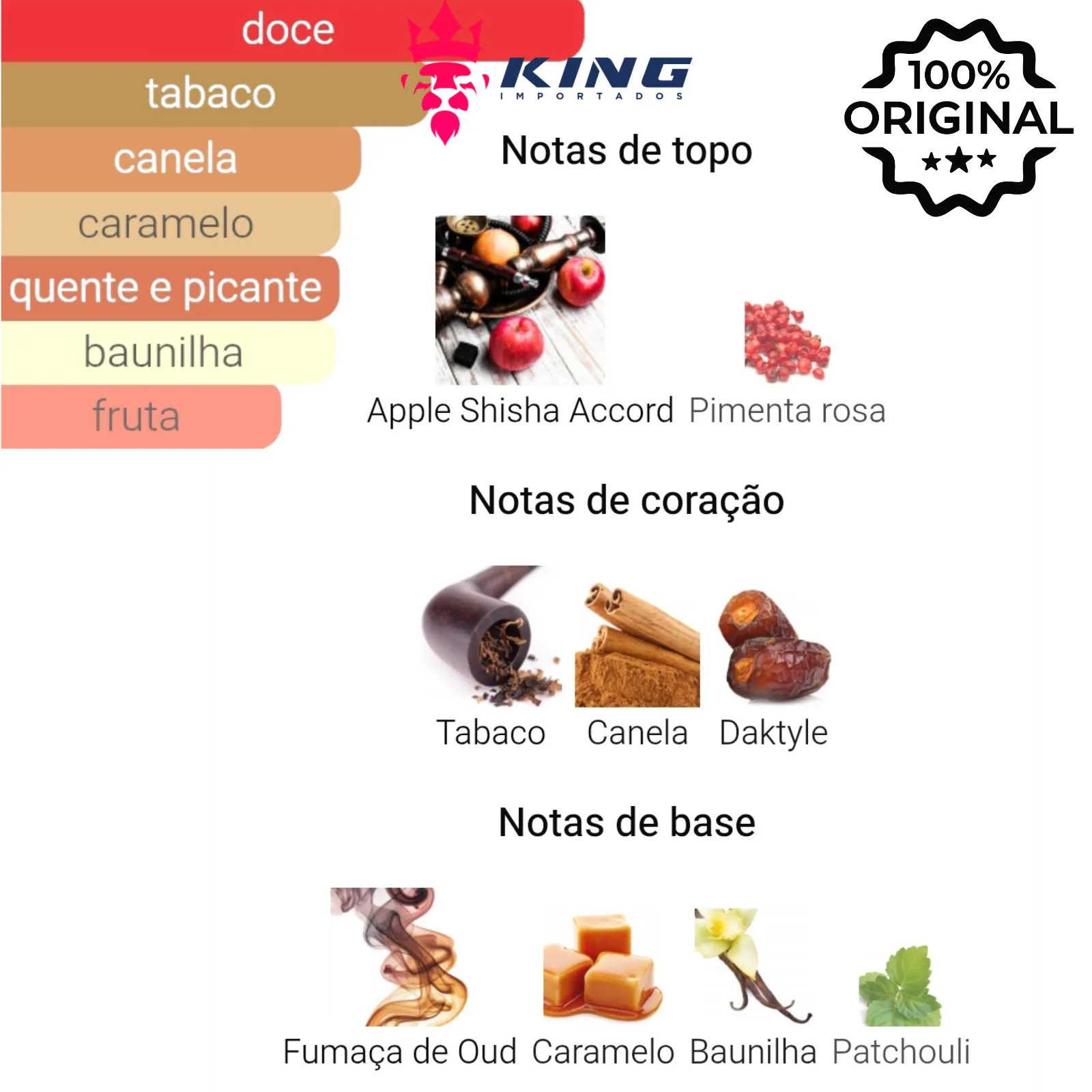 Notas de Base: Fumaça de Oud 🪵, Caramelo 🍬, Baunilha 🍦, Patchouli 🌱
