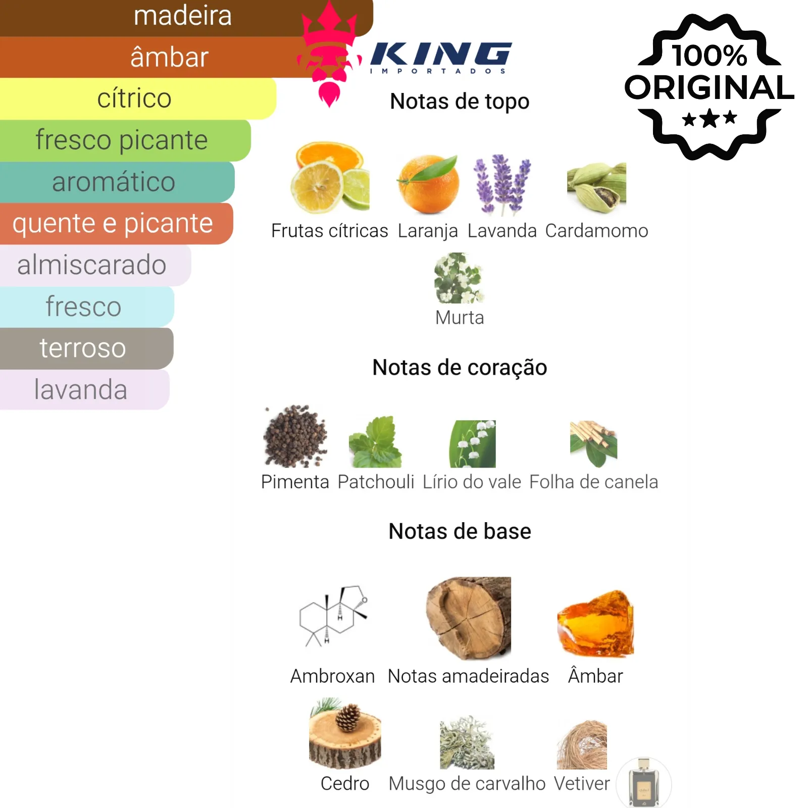Base: Ambroxan ✨, Notas Amadeiradas 🌳, Âmbar 🔥, Cedro 🌲, Musgo de Carvalho 🌳, Vetiver 🌱