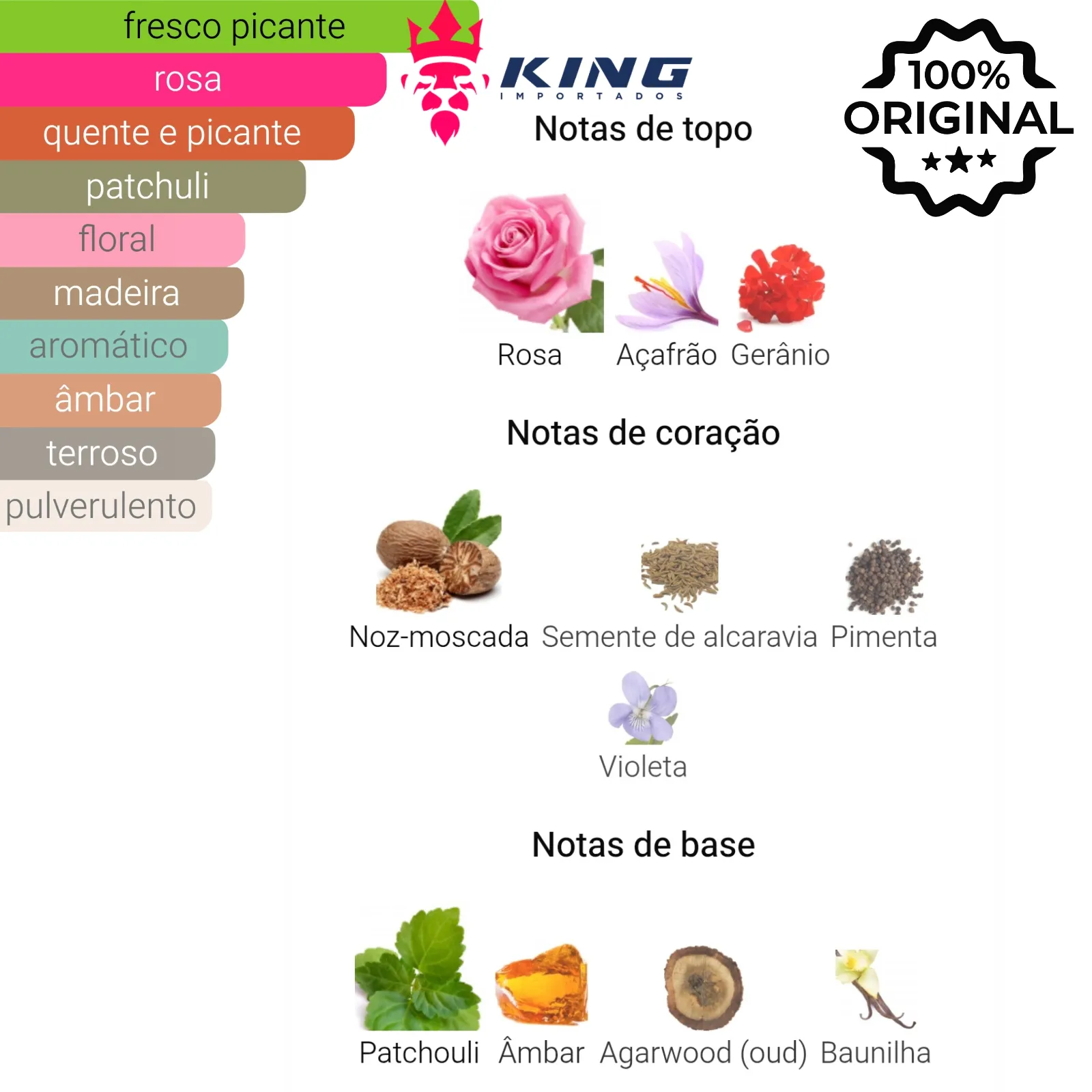 Coração: Noz-moscada 🌰, Alcarávia 🌿, Pimenta 🌶️, Violeta 💜