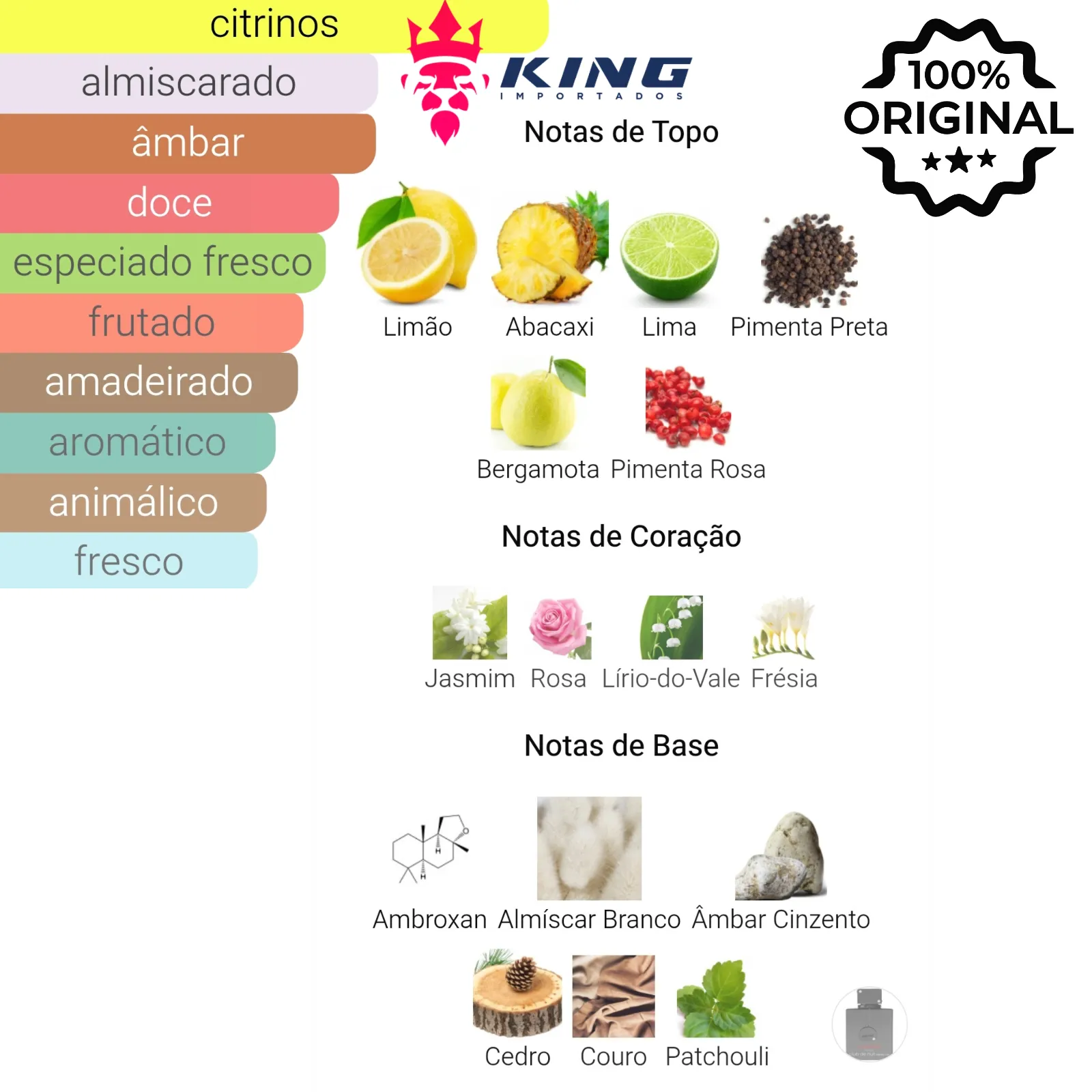 Topo: Limão 🍋, Abacaxi 🍍, Lima 🍈, Pimenta Preta 🌶, Bergamota 🍊, Pimenta Rosa 💗