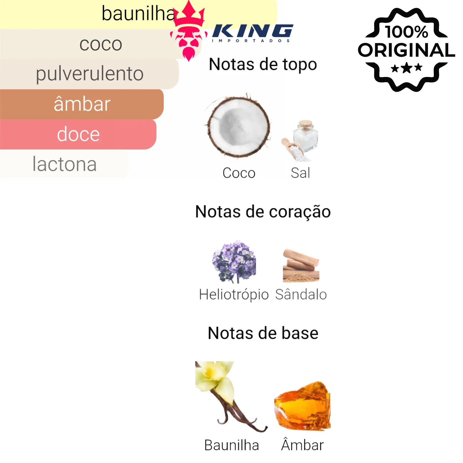 Queen of Arabia abre com um acorde cremoso e salgado, onde o coco e o toque de sal evocam uma sensação luxuosa e sensual. No coração, o heliotrópio traz suavidade floral e o sândalo adiciona um toque quente e envolvente. A base de baunilha e âmbar finaliza com profundidade e um rastro adocicado, elegante e marcante.