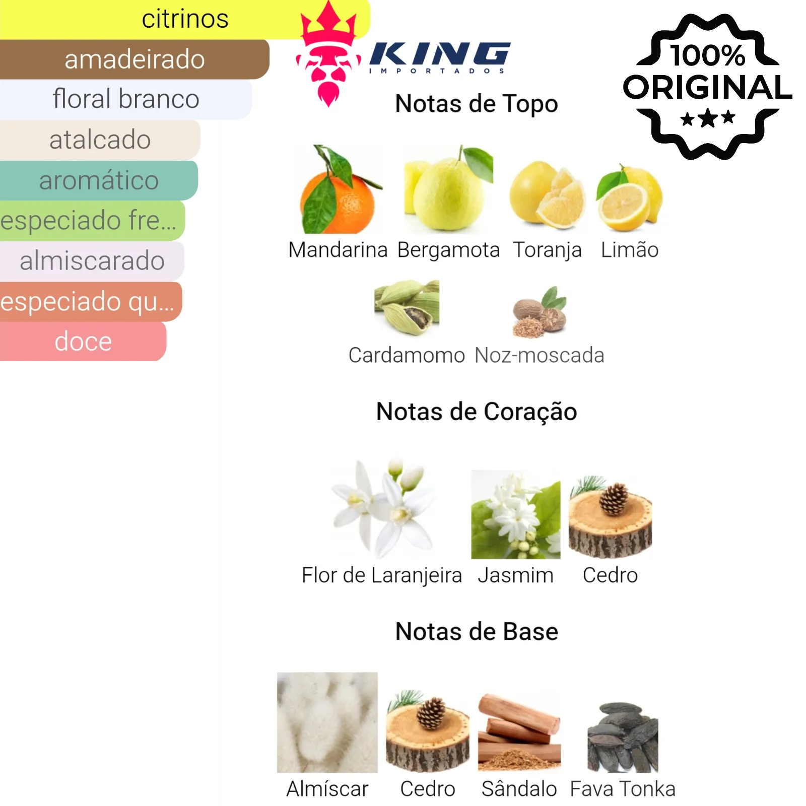 Notas de Topo: Mandarina 🍊, Bergamota 🍋, Toranja 🍈, Limão 🍃, Cardamomo 🌿, Noz-Moscada 🌰