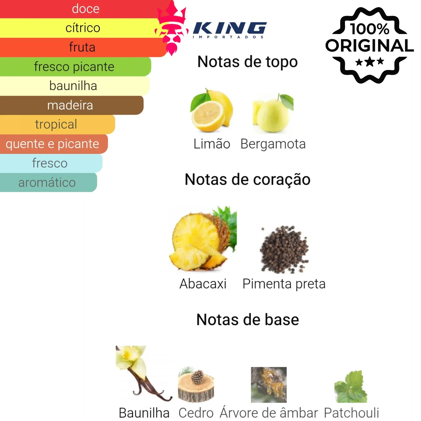 🌳 Base: Baunilha, Madeira de Âmbar, Cedro, Patchouli