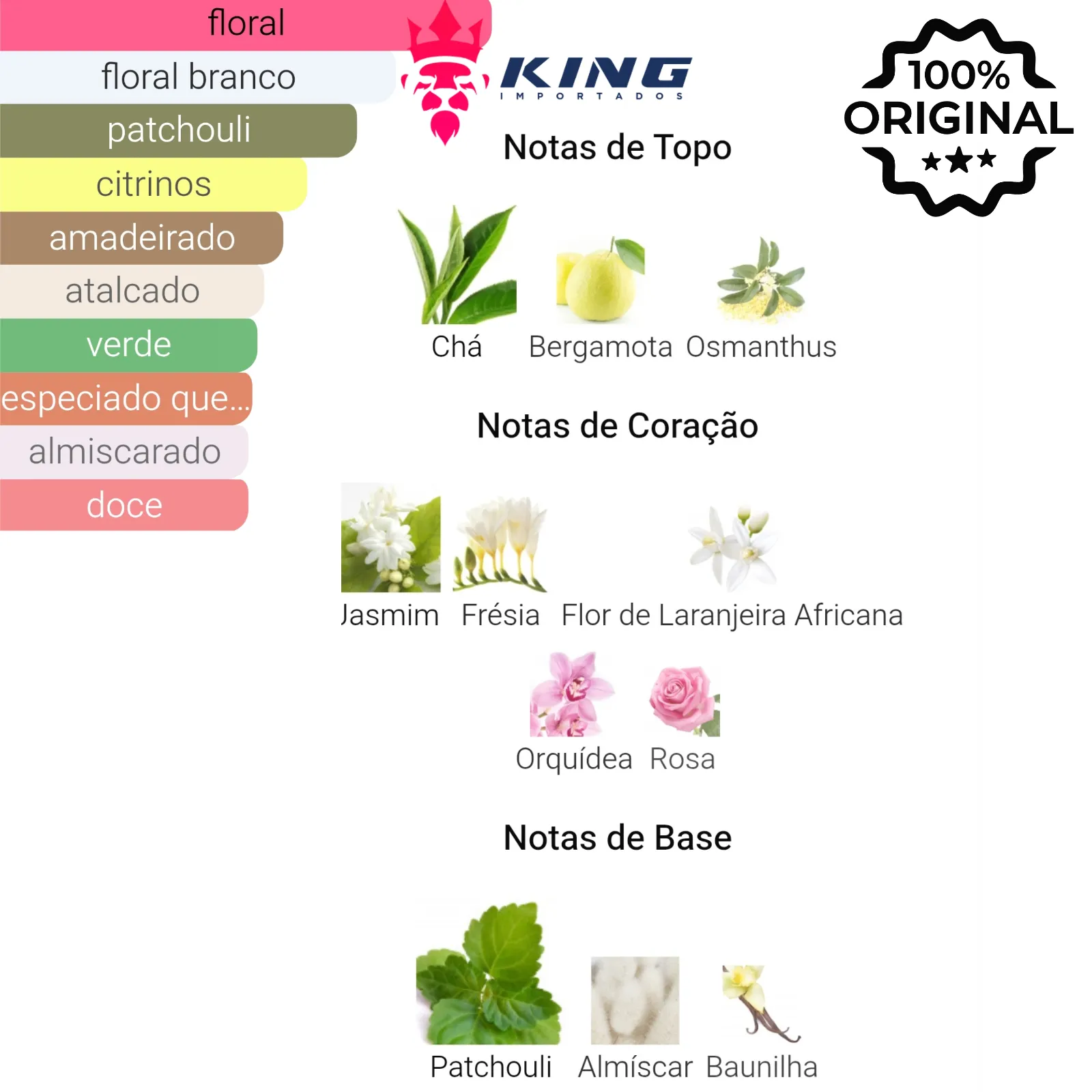 🌳 Base: Patchouli, Almíscar, Baunilha