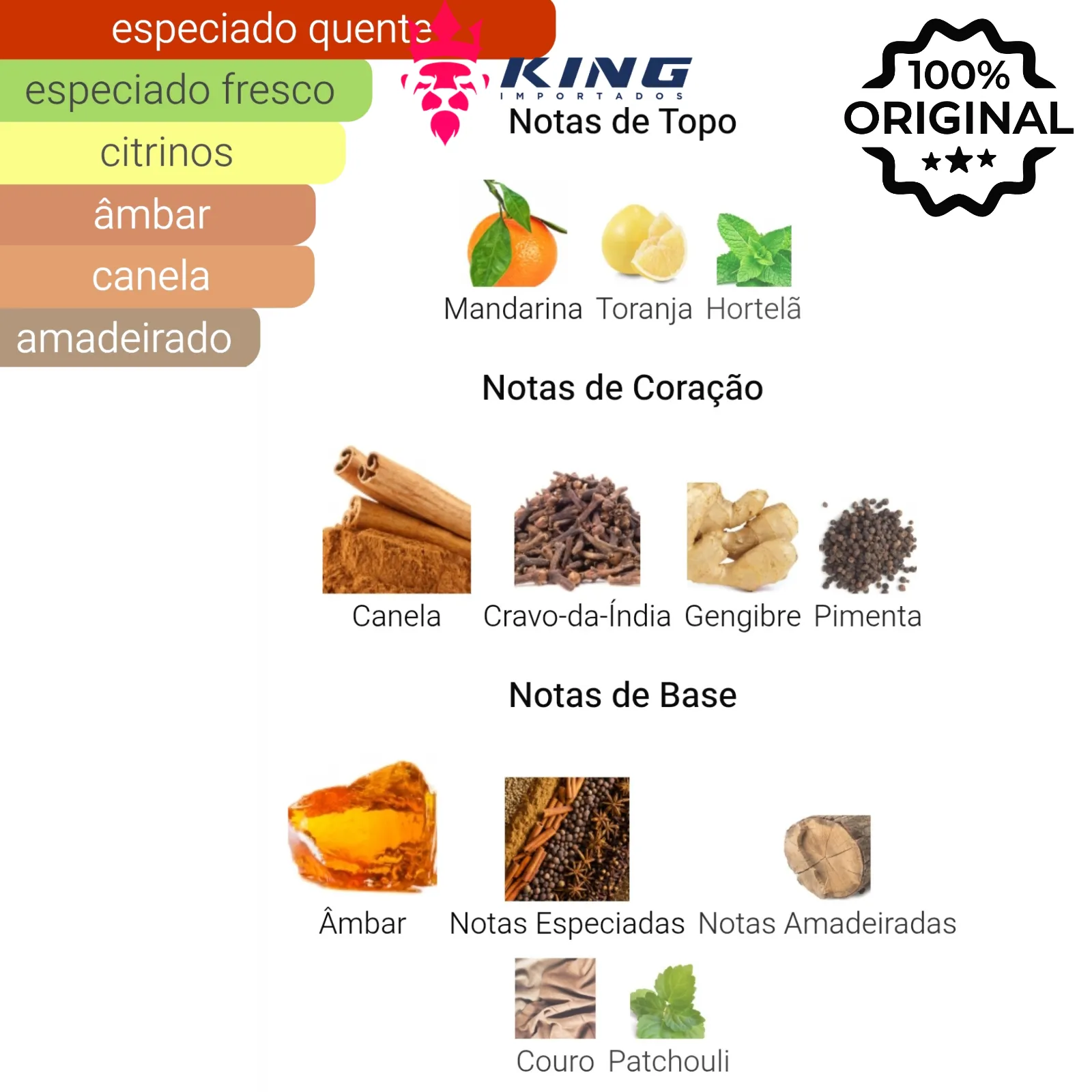 🌳 Base: Âmbar, Notas Especiadas, Notas Amadeiradas, Couro, Patchouli