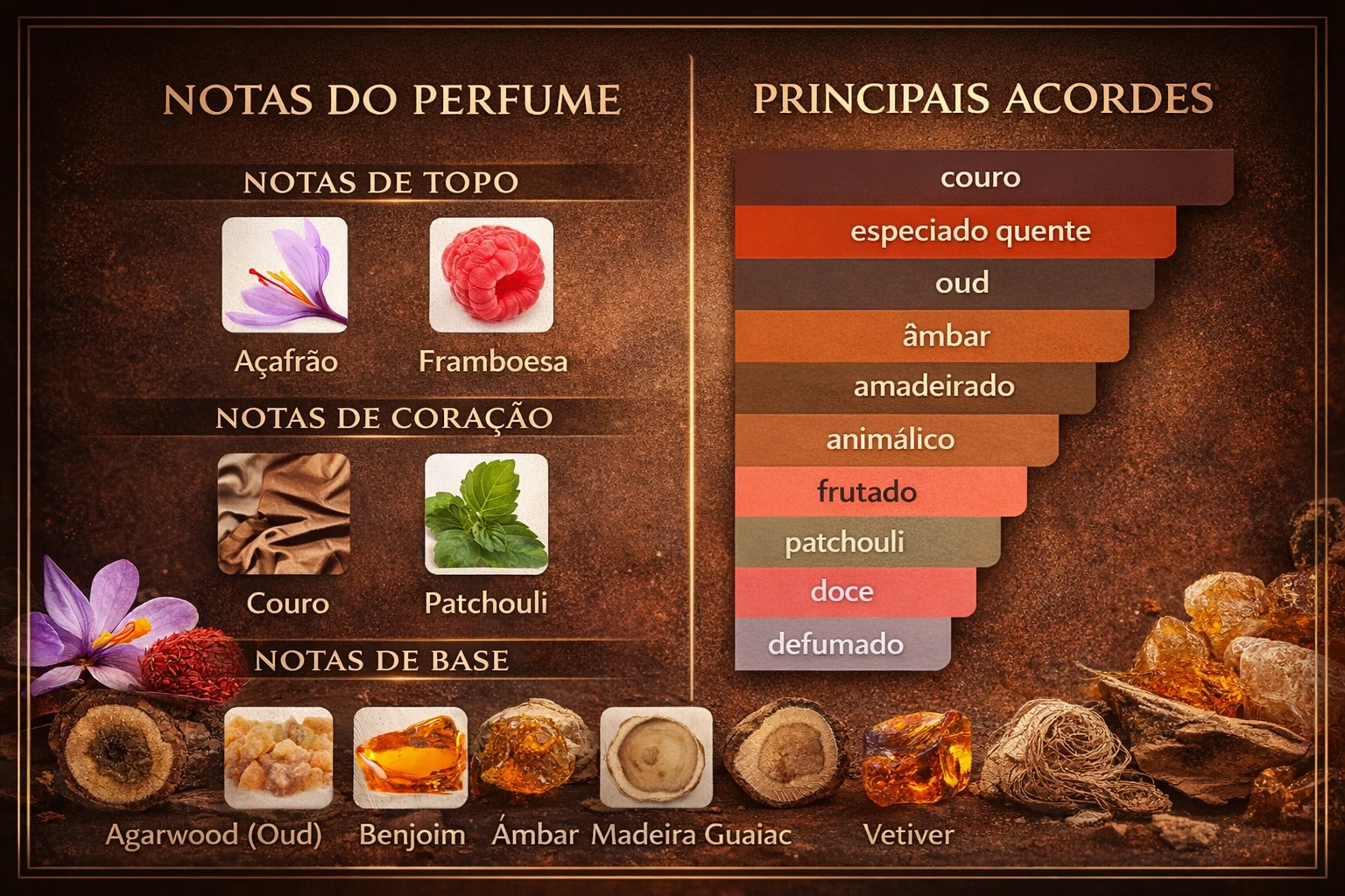 ✨ Perfil do Aroma: Oriental • Amadeirado • Especiado • Ambarado • Elegante