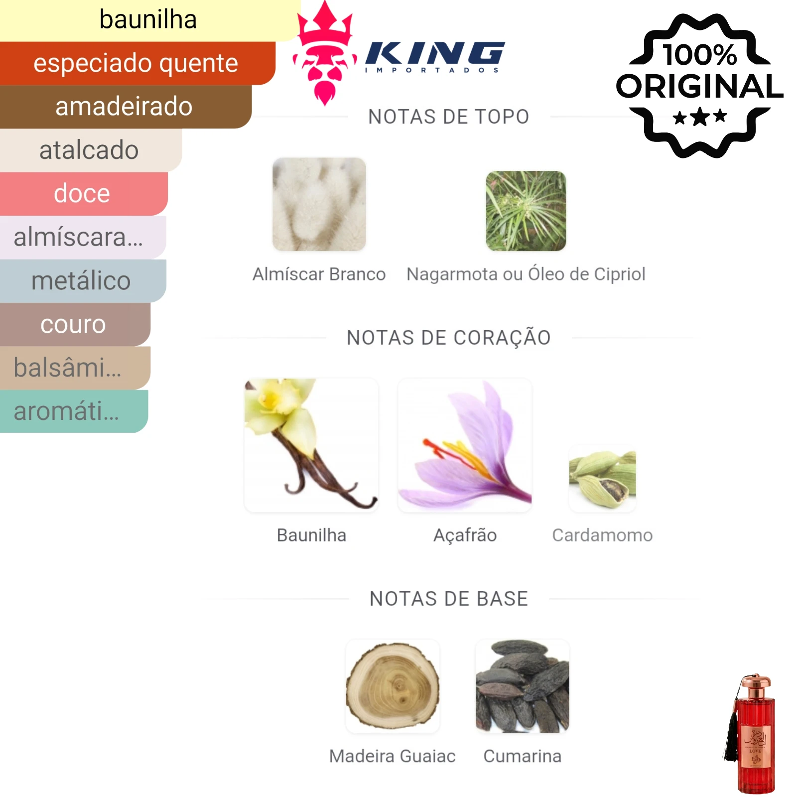 Durrat Al Aroos Love se abre com um toque limpo e elegante do almíscar branco, contrastado pela profundidade terrosa e sofisticada da nagarmota. No coração, a baunilha cremosa se mistura às especiarias quentes de açafrão e cardamomo, criando uma aura sensual e envolvente. A base de madeira guaiac e cumarina adiciona calor, profundidade e um rastro adocicado e elegante, tornando essa fragrância intensa, feminina e inesquecível.