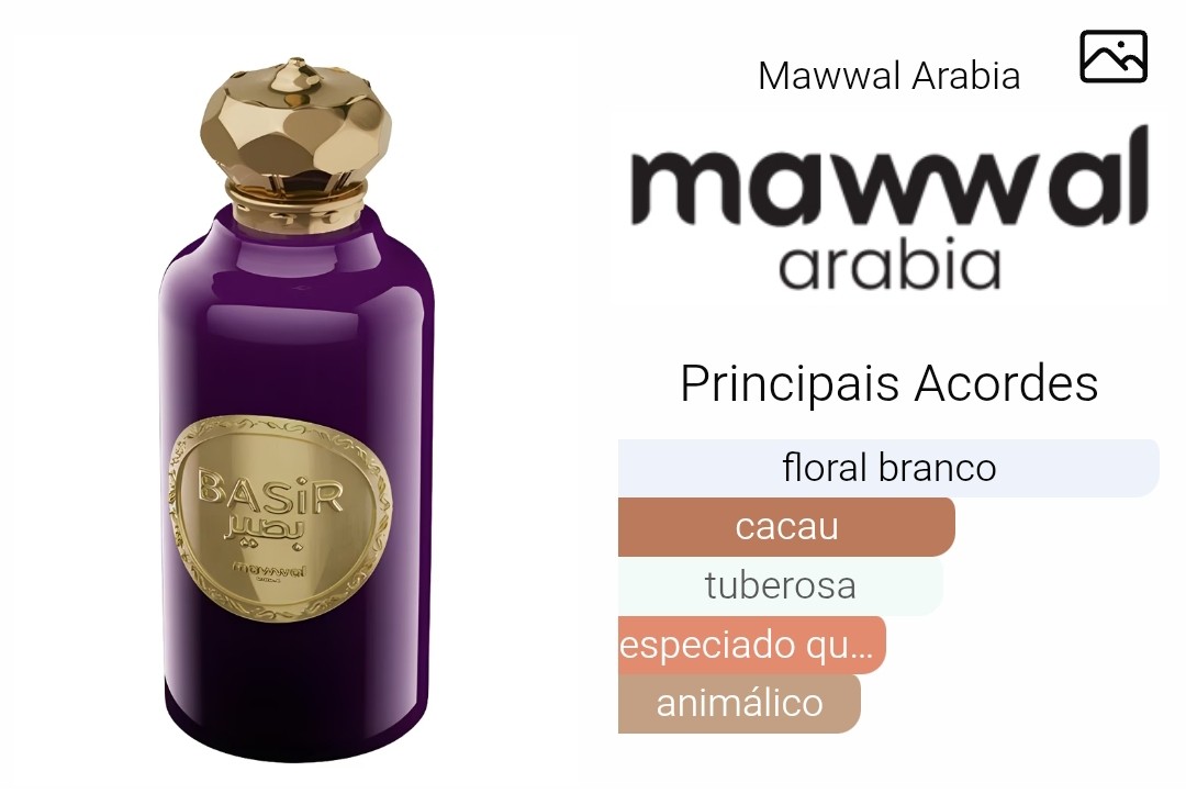 Basir, da Mawwal Arabia, é uma fragrância oriental floral compartilhável que entrega sofisticação e profundidade em uma composição ousada e envolvente. Lançado em 2024, combina flores brancas luminosas com acordes intensos de cacau e tabaco, criando um perfume marcante, elegante e memorável.