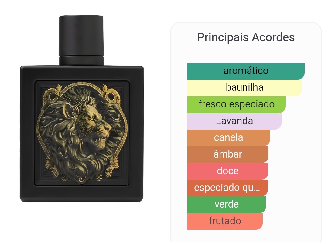Lion de Rayhaan é um perfume Aromático Especiado Masculino criado para homens confiantes, que gostam de marcar território com sofisticação. Lançado em 2024, ele combina frescor aromático com especiarias quentes e uma base envolvente, resultando em uma fragrância moderna, intensa e extremamente masculina.