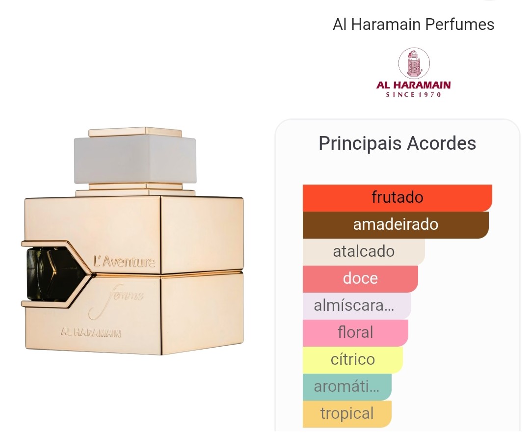 L’Aventure Femme, da Al Haramain Perfumes, é uma fragrância floral frutada feminina que combina energia, sofisticação e charme natural. Lançado em 2017, este perfume é perfeito para mulheres que gostam de aromas marcantes, frescos e elegantes, ideais para o dia a dia ou ocasiões especiais.