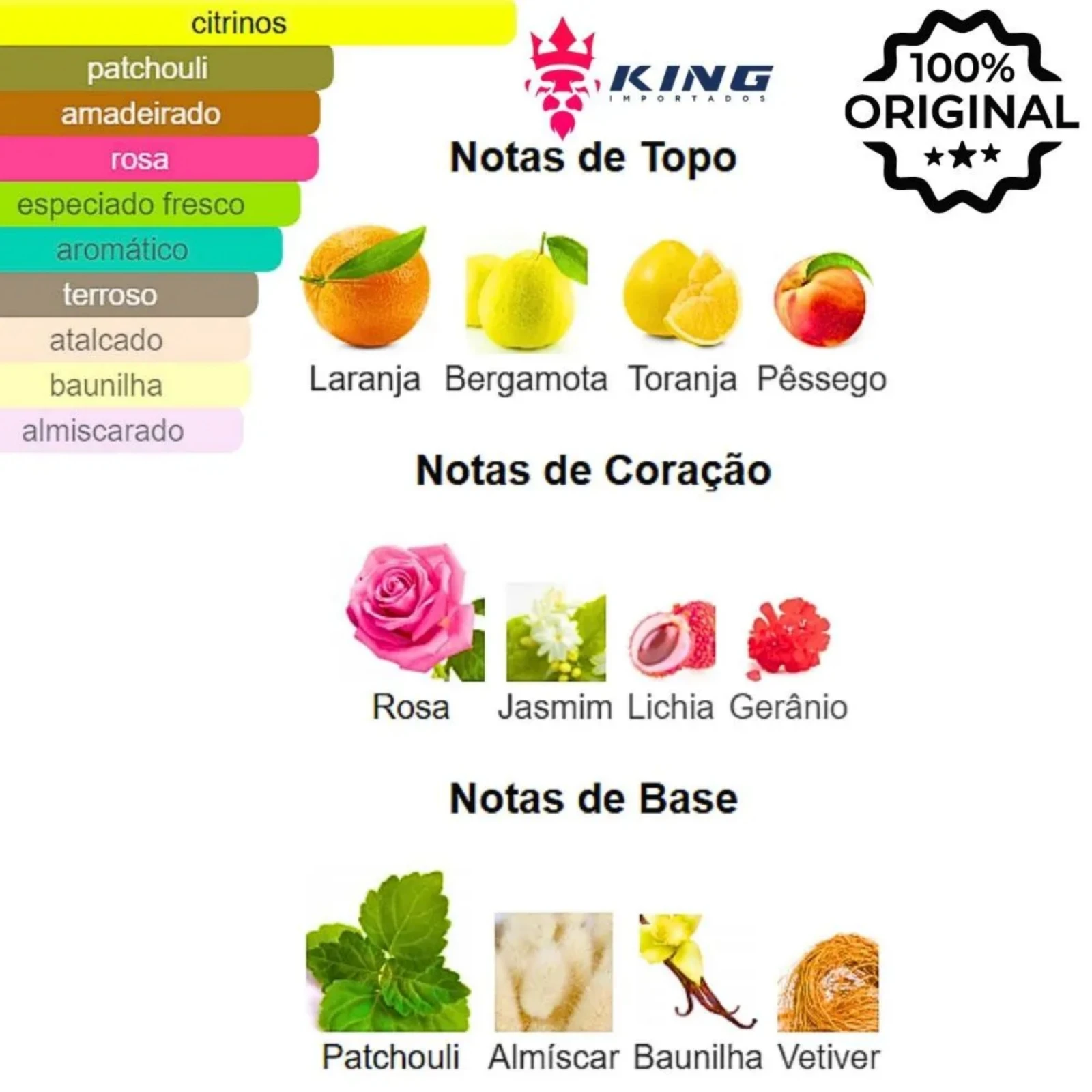 Notas de Topo: Laranja 🍊, Toranja 🍋, Bergamota 🍊, Pêssego 🍑