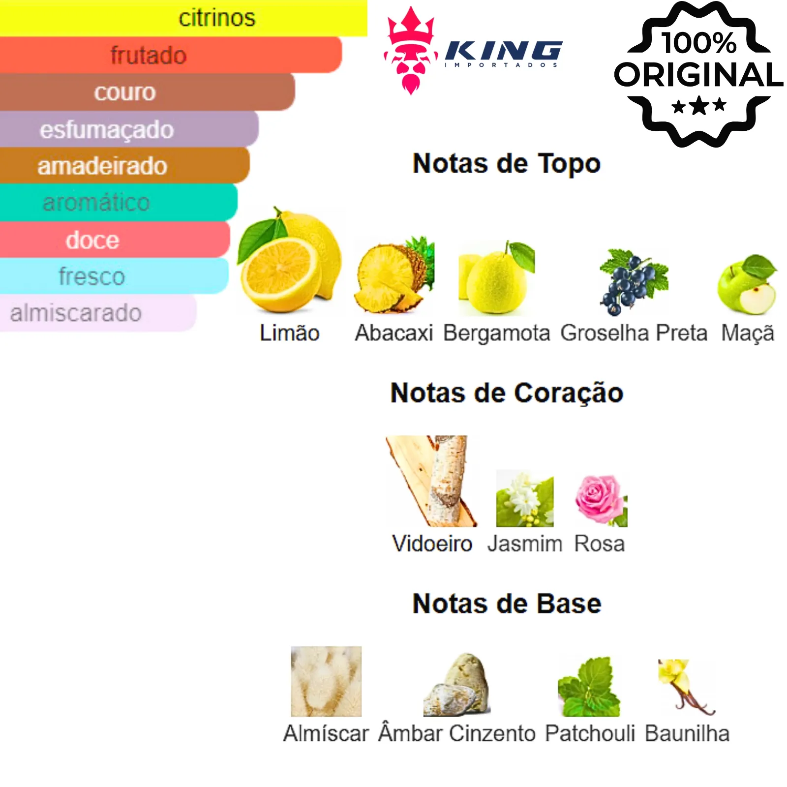 Notas de Topo: Limão 🍋, Abacaxi 🍍, Groselha Preta 🍇, Bergamota 🍊, Maçã 🍎