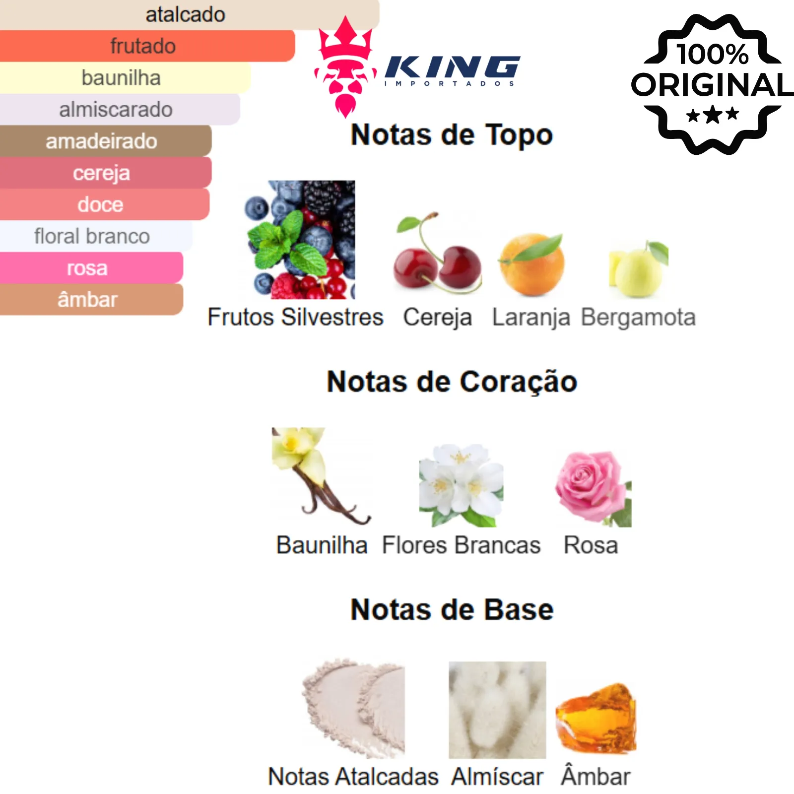 Mais Detalhes sobre a Fragrância: Yum Yum abre com uma explosão suculenta e vibrante de frutos silvestres, cereja, laranja e bergamota, criando uma introdução doce e efervescente. No coração, a cremosidade da baunilha se entrelaça com a delicadeza das flores brancas e a elegância da rosa, formando um buquê floral convidativo. A base de notas atalcadas, almíscar e âmbar confere um rastro suave, aconchegante e duradouro, com uma sensação de limpeza e conforto.