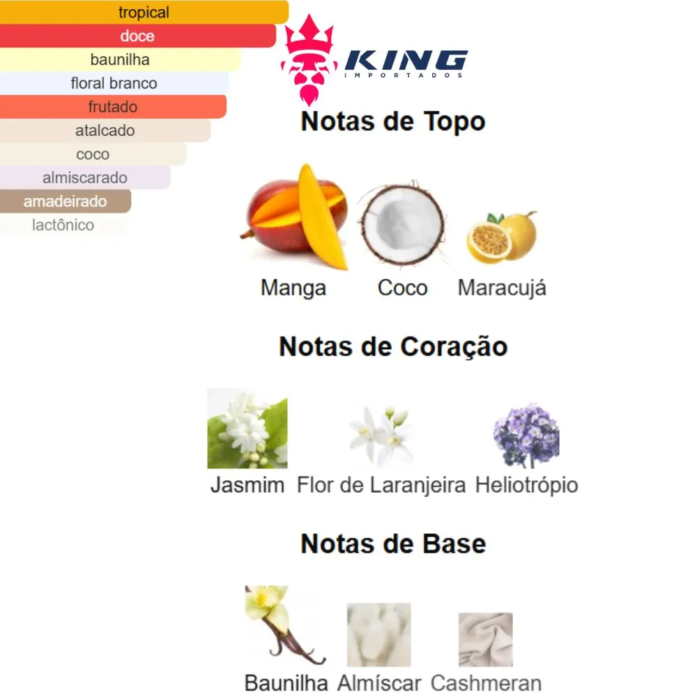 Melhor Momento para Usar: Ideal para primavera e verão, tanto de dia quanto em noites mais amenas, quando suas notas tropicais e florais se destacam e proporcionam uma sensação de frescor e bem-estar.