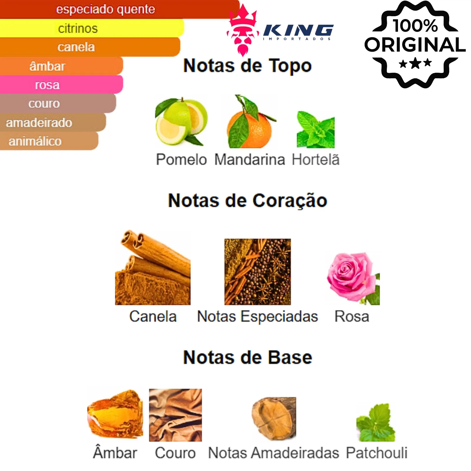 Notas de Coração: Canela 🍂, Notas Especiadas 🌶️, Rosa 🌹