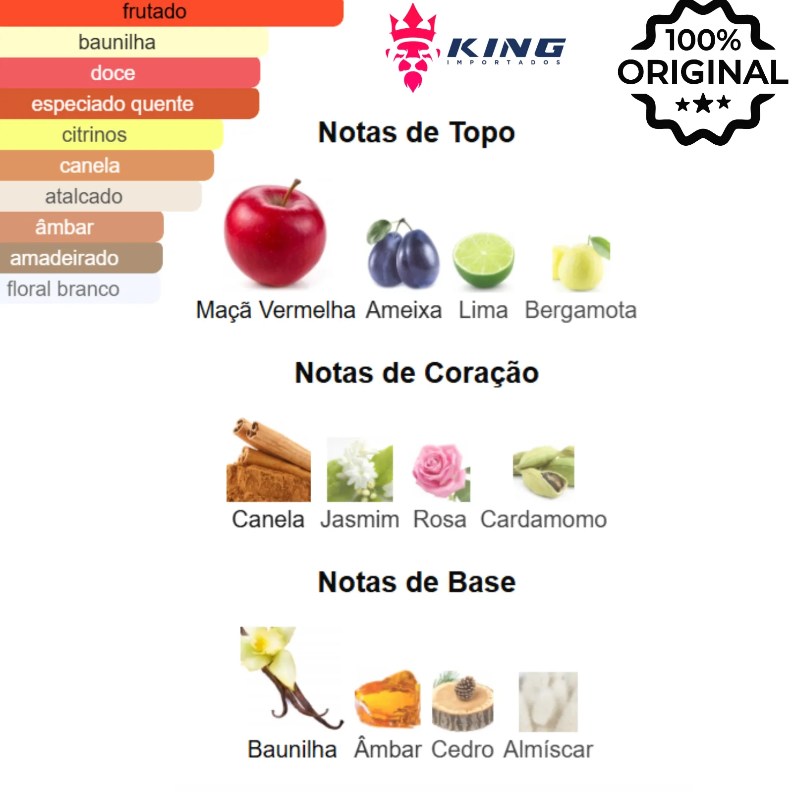 Notas de Topo: Maçã Vermelha 🍎, Ameixa 💜, Lima 🍋, Bergamota 🍊