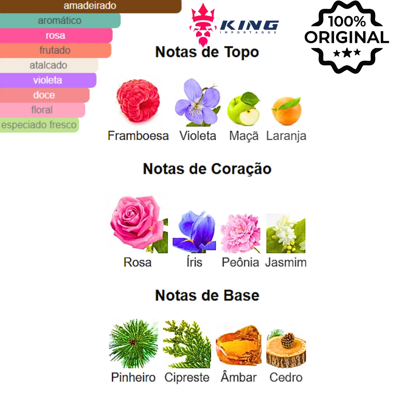 Notas de Topo: Framboesa 🍓, Violeta 💜, Maçã 🍎, Laranja 🍊