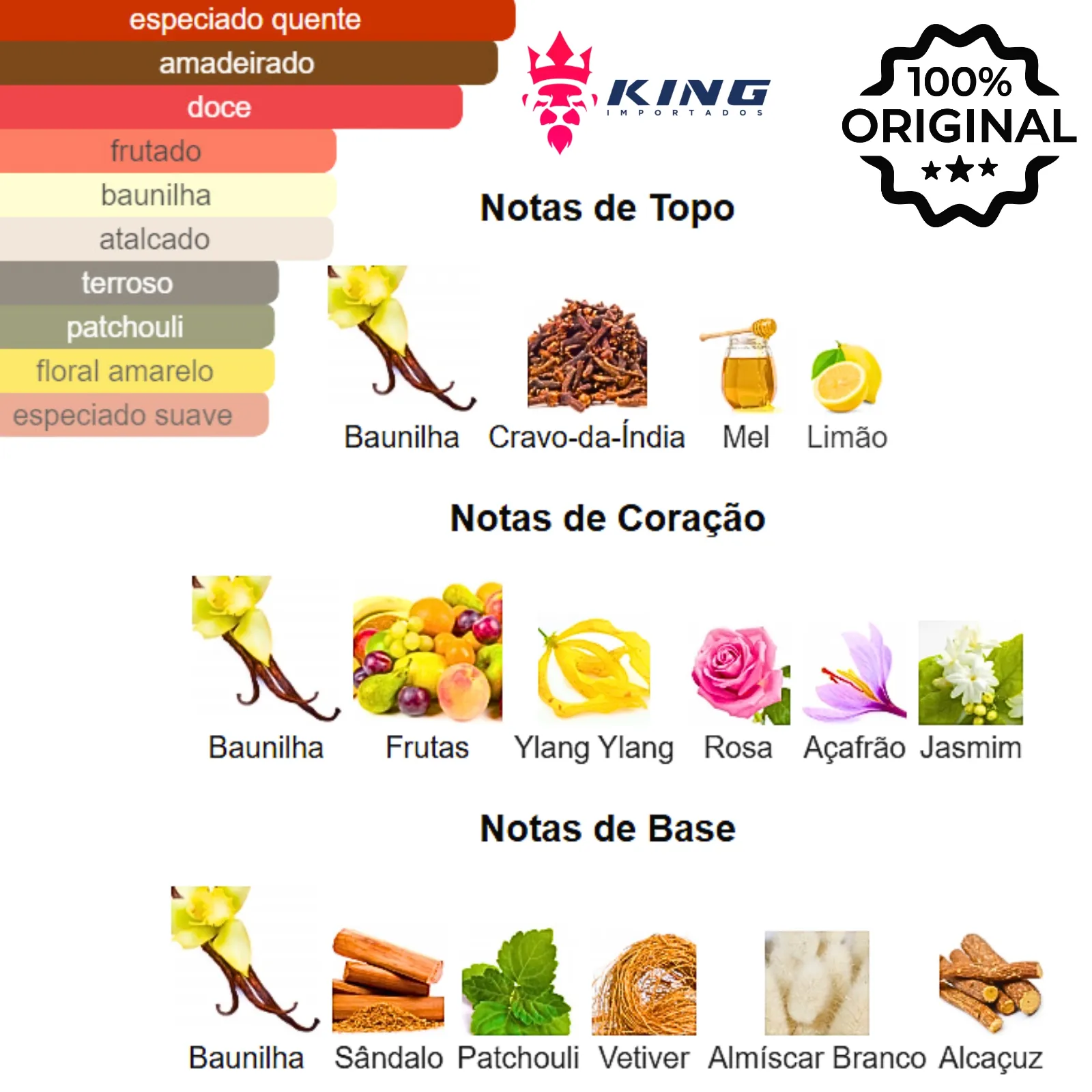 Notas de Coração: Rosa 🌹, Ylang Ylang 🌼, Frutas 🍎, Jasmim , Baunilha 🍦, Açafrão 🧡