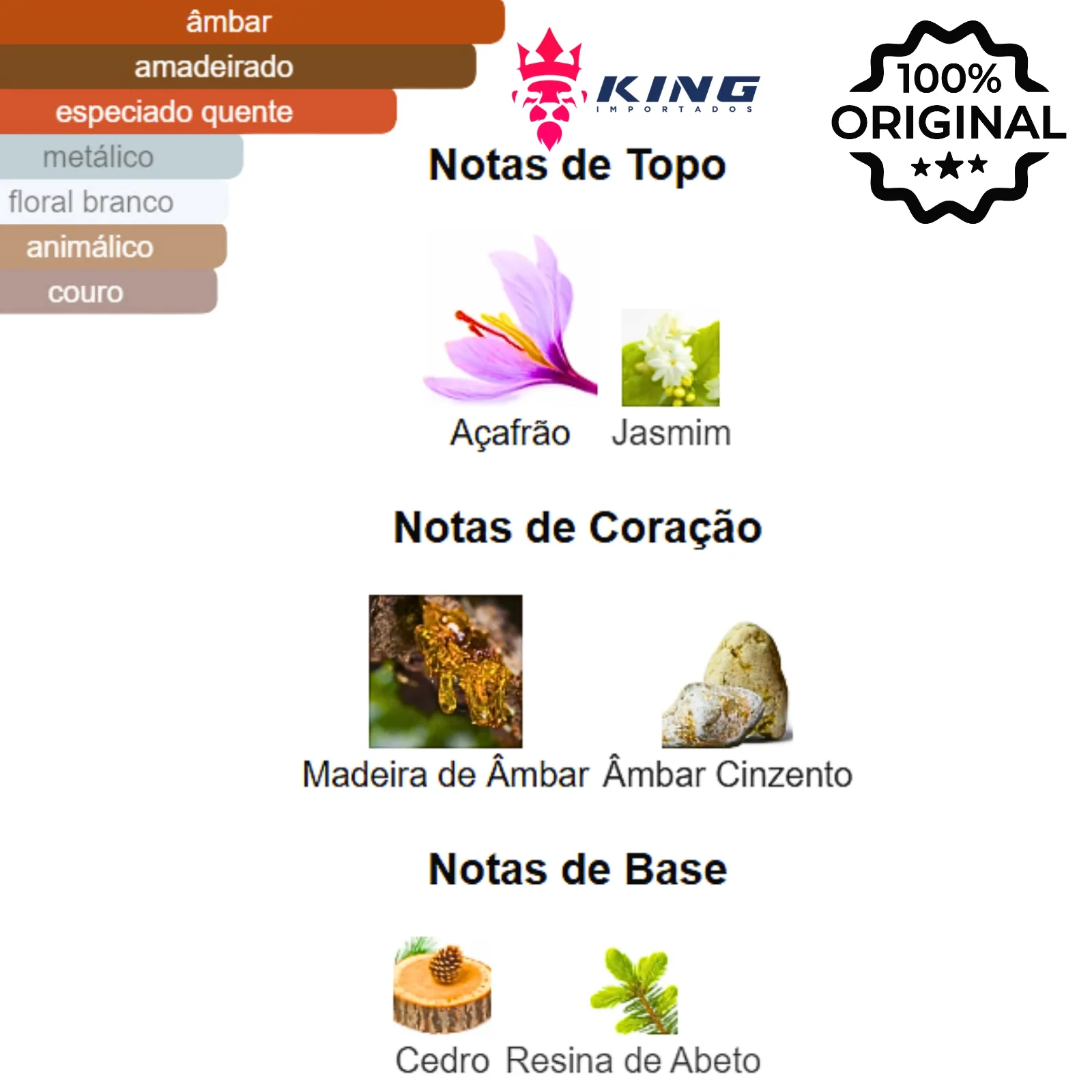 Mais Detalhes sobre a Fragrância: Amber Rouge se inicia com uma abertura luxuosa e intrigante de açafrão, que confere um toque especiado e levemente doce, complementado pela delicadeza floral e inebriante do jasmim. No coração, a fragrância se aprofunda na sua essência âmbar, com a riqueza da madeira de âmbar e a complexidade do âmbar cinzento, que trazem uma sensação de calor, resina e um toque salgado e mineral. A base é sólida e duradoura, com a secura elegante do cedro e o frescor balsâmico da resina de abeto, que ancoram a composição e proporcionam um rastro amadeirado e resinoso, extremamente sofisticado e envolvente.