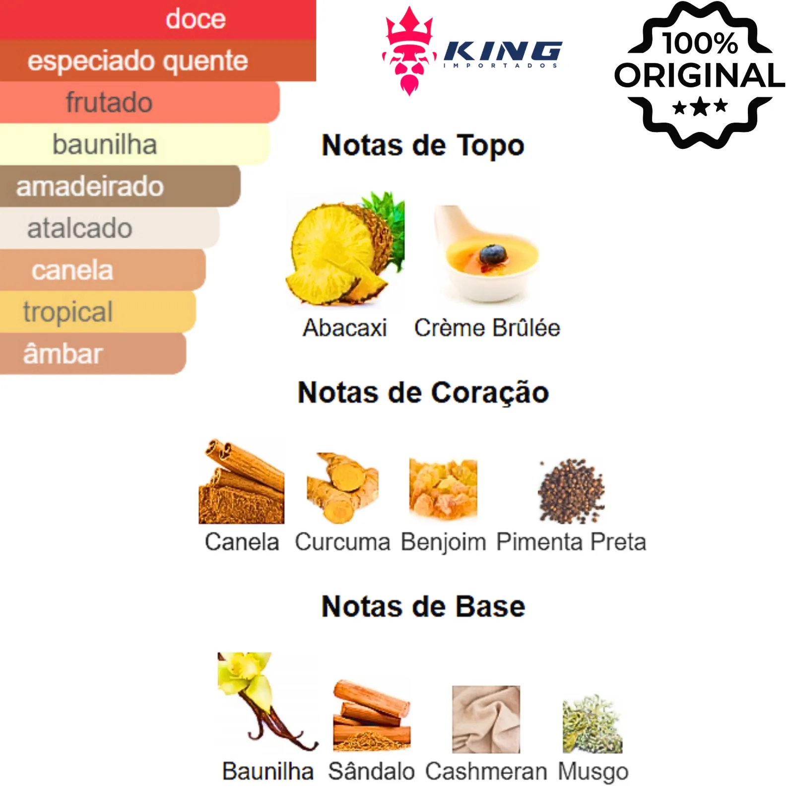 Notas de Coração: Canela 🍂, [Curcuma], Pimenta Preta 🌶️, [Benjoim]