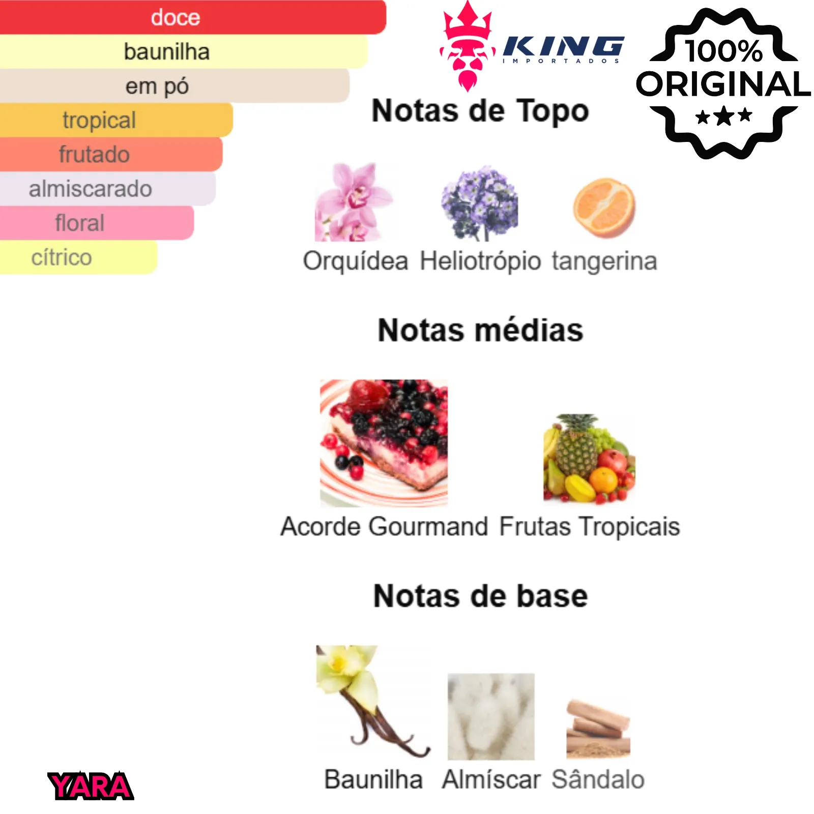 1️⃣ Perfume Yara 100ml Yara é uma fragrância Floral Frutada Gourmand Feminina, que evoca uma aura de delicadeza, mistério e doçura tropical. Lançada em 2020, é perfeita para a mulher que busca um aroma envolvente e memorável.