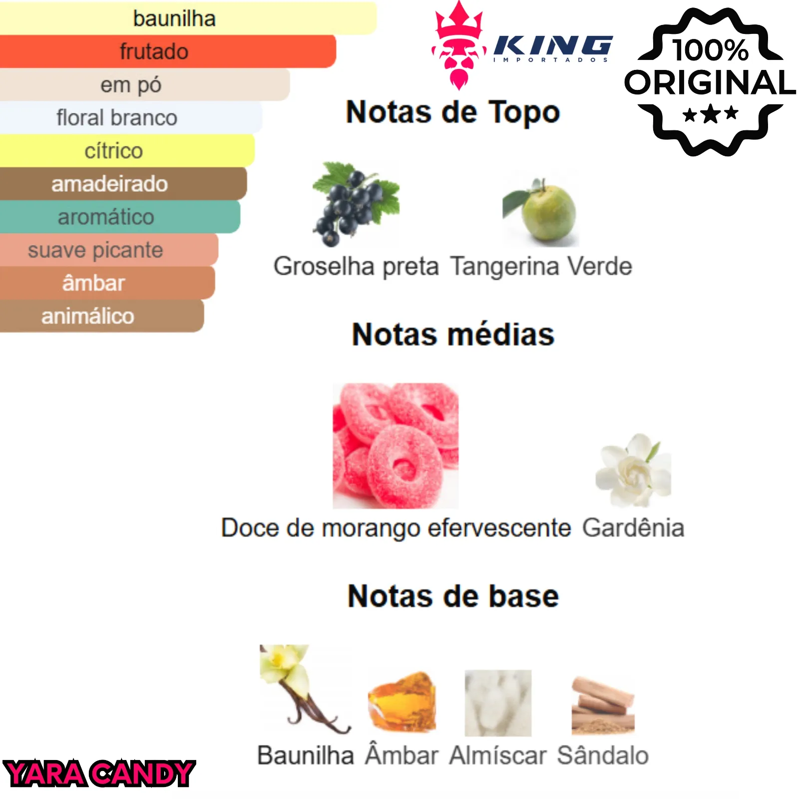 2️⃣ Perfume Yara Candy 100ml Yara Candy (também conhecido como Yara Moi) é uma fragrância Floral Frutada Gourmand Feminina, que transporta para um universo de doçura e sofisticação. Lançada em 2022, é perfeita para a mulher que busca um aroma envolvente e irresistível.
