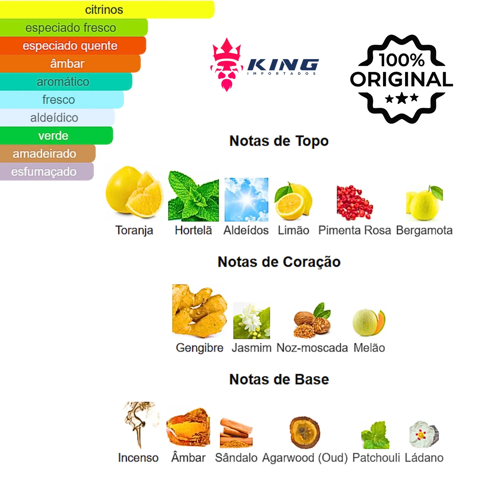 Notas de Topo: Toranja , Bergamota 🍊, [Aldeídos], Limão , Hortelã , Pimenta Rosa 🌶️