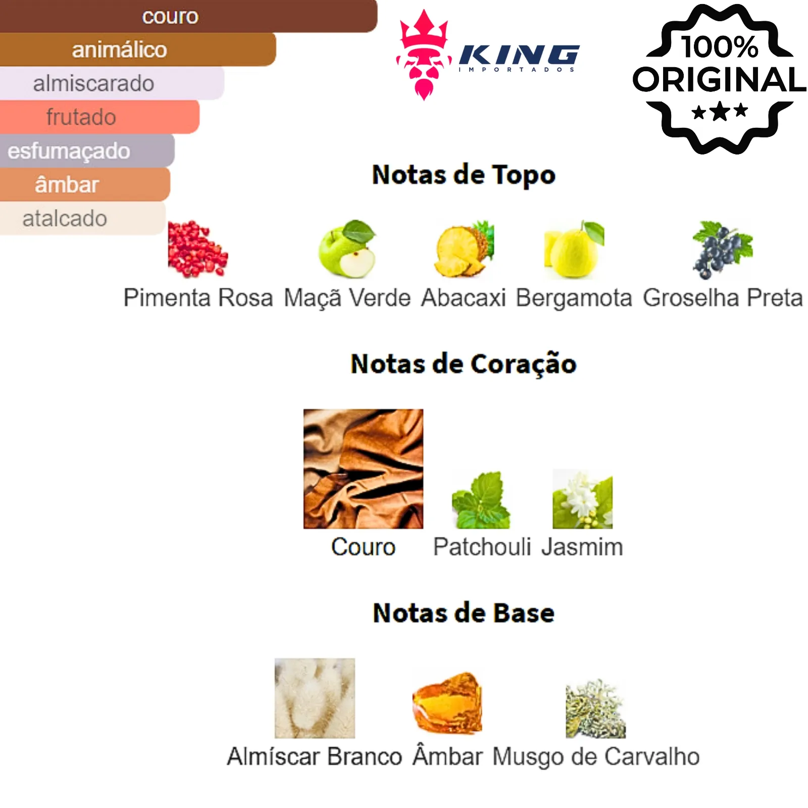 Notas de Topo: 🍇 Groselha Preta, 🍏 Maçã Verde, 🍍 Abacaxi, 🍊 Bergamota, 🌶️ Pimenta Rosa