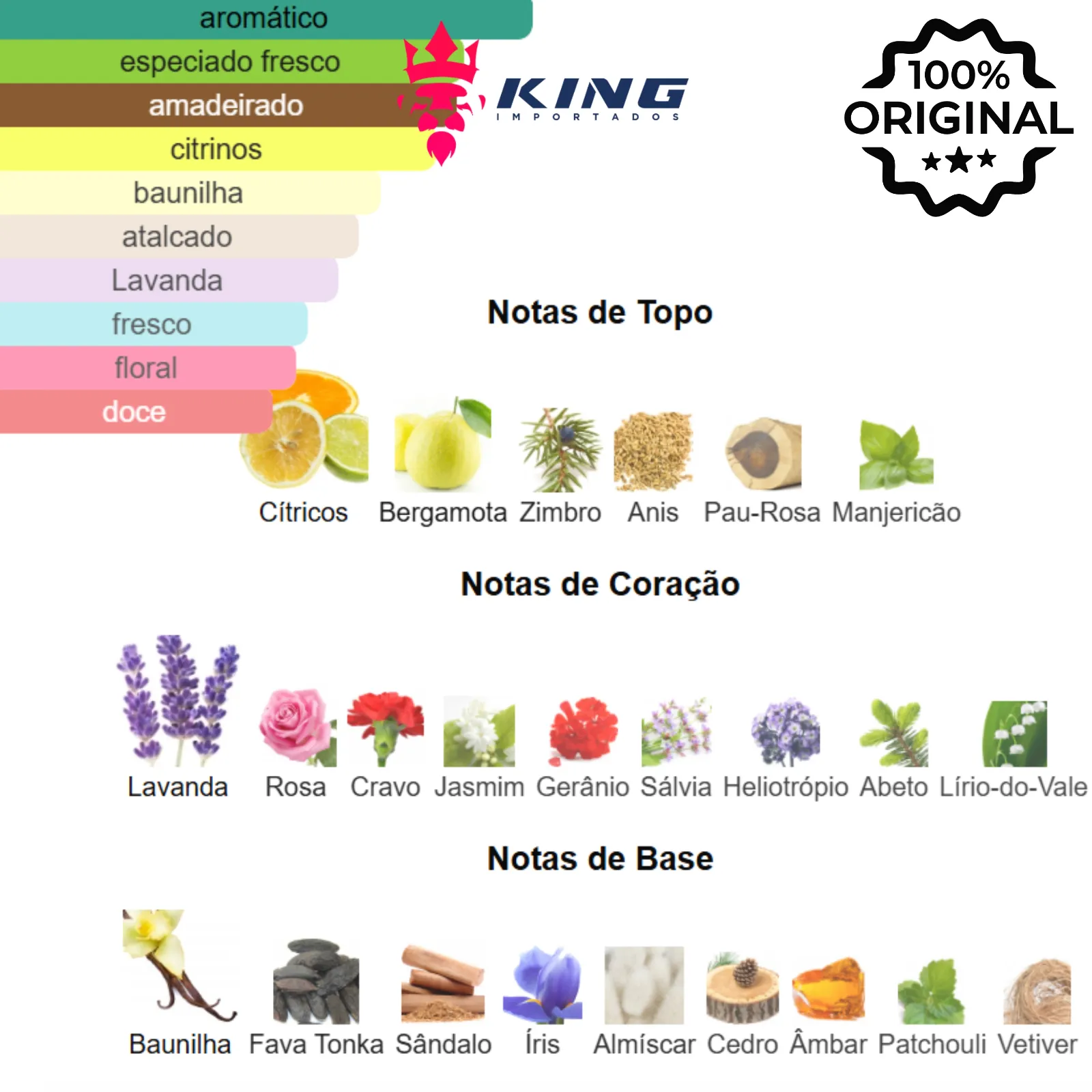 Principais Tipos de Aroma: Aromático, Fougére, Amadeirado, Cítrico, Floral, Especiado Fresco, Baunilha, Atalcado.