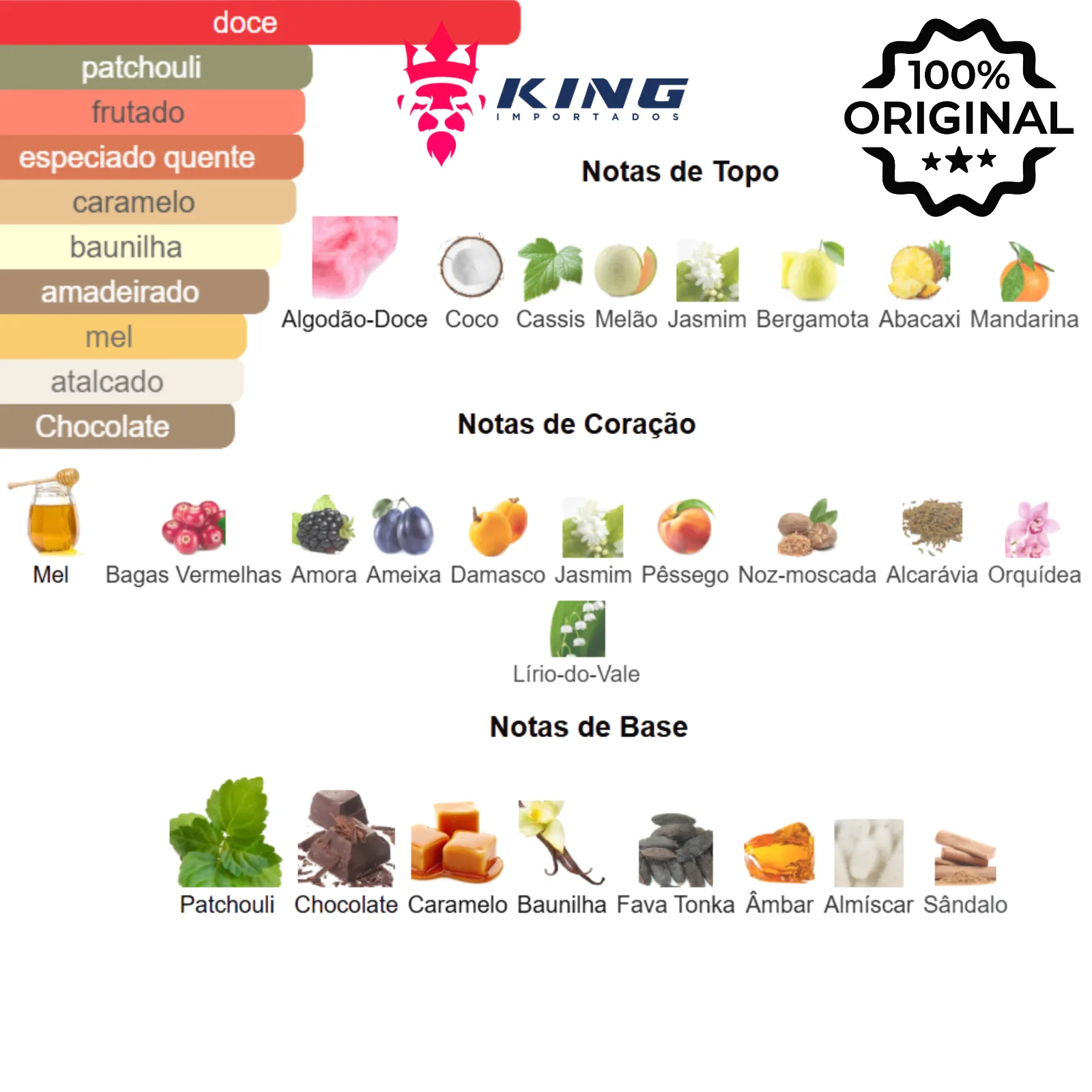 Principais Tipos de Aroma: Oriental, Baunilha, Gourmand, Doce, Frutado, Amadeirado, Especiado, Atalcado.