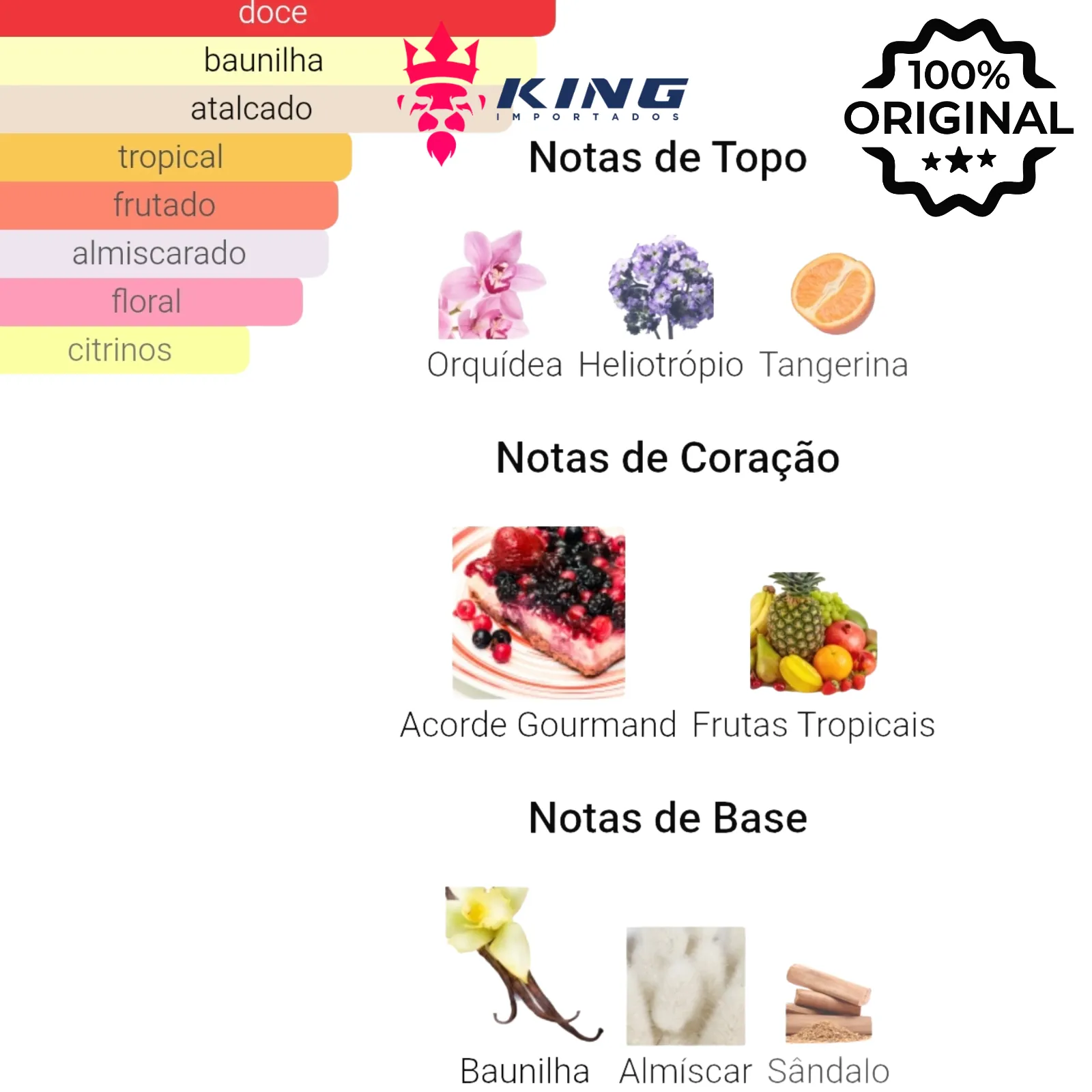 Principais Tipos de Aroma: Floral, Frutado, Gourmand, Doce, Baunilha, Atalcado, Amadeirado.
