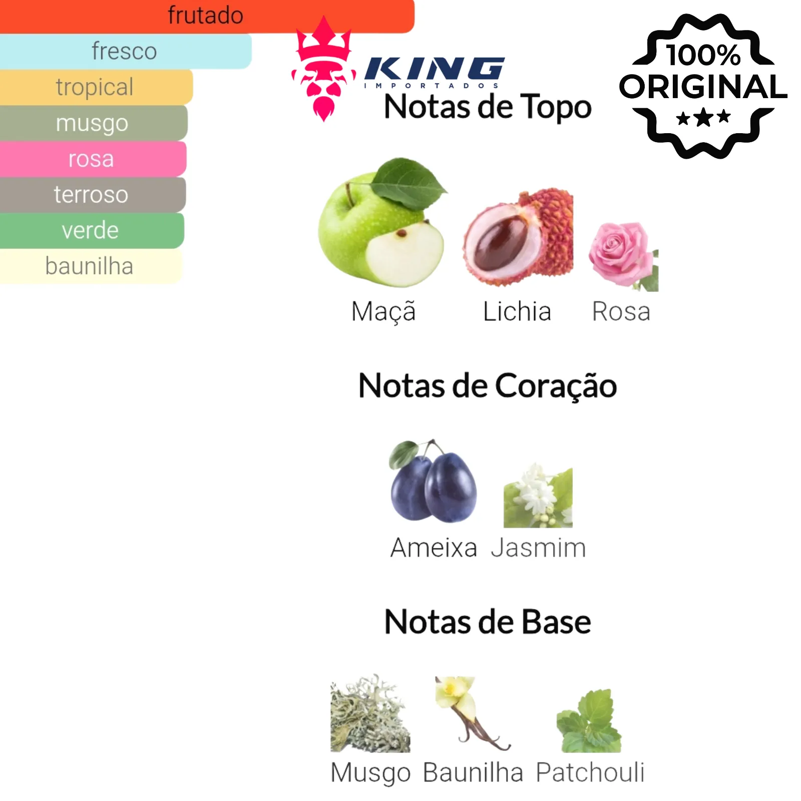 Notas de Topo: 🍏 Maçã, 🍓 Lichia, Rosa
