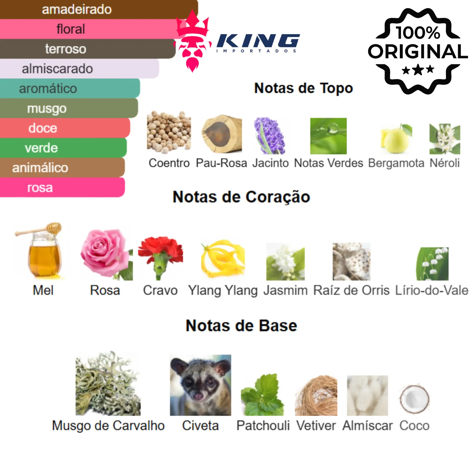 Principais Tipos de Aroma: Chipre, Amadeirado, Floral, Doce, Especiado, Animálico, Terroso.