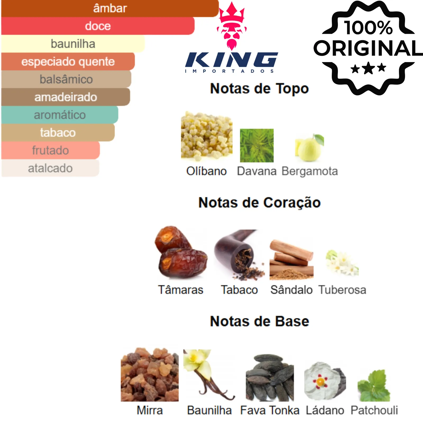 ✨ Perfil do Aroma: Oriental • Especiado • Amadeirado • Doce • Resinoso • Tabaco • Floral
