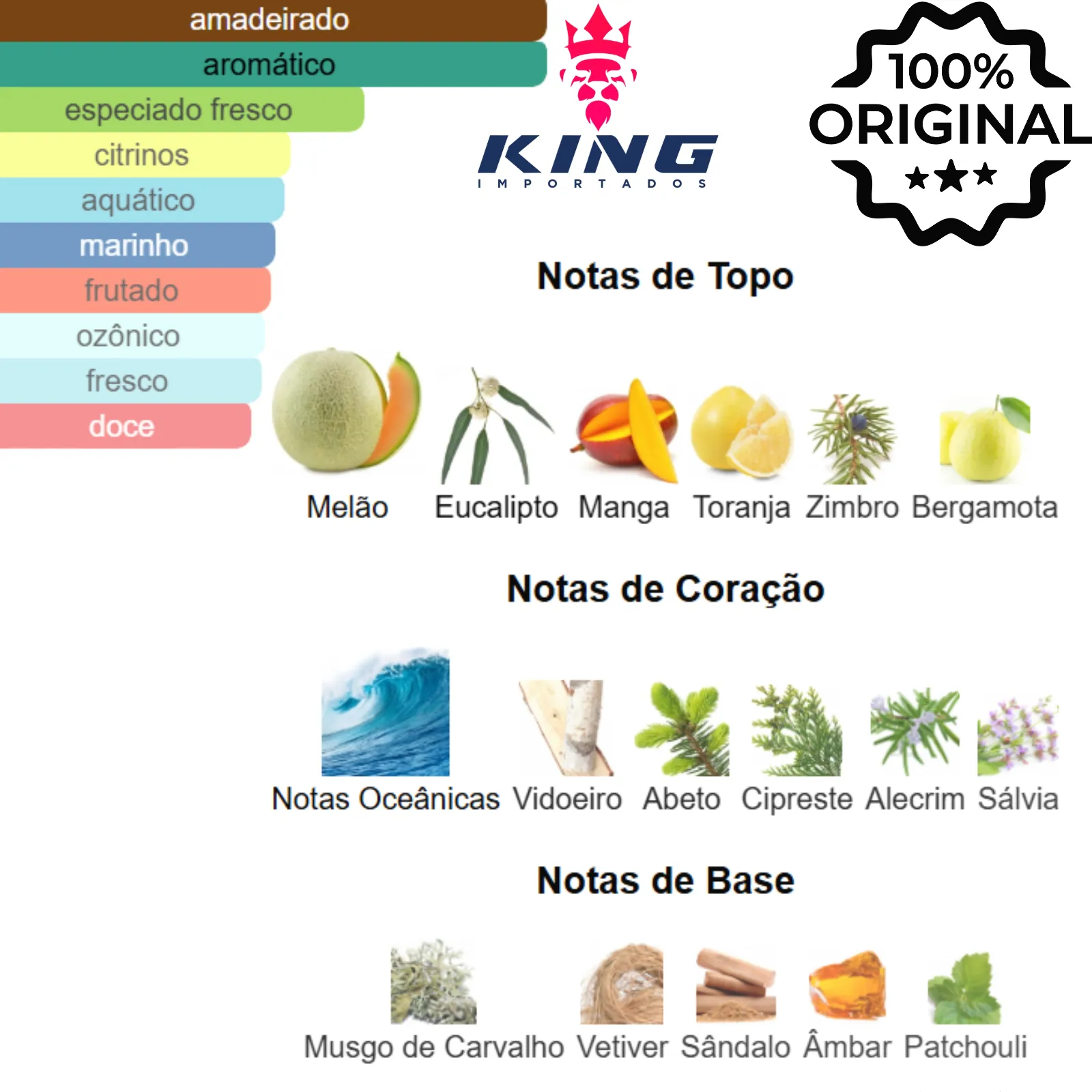 Principais Tipos de Aroma: Aromático, Verde, Aquático, Frutado, Amadeirado, Fresco, Cítrico.
