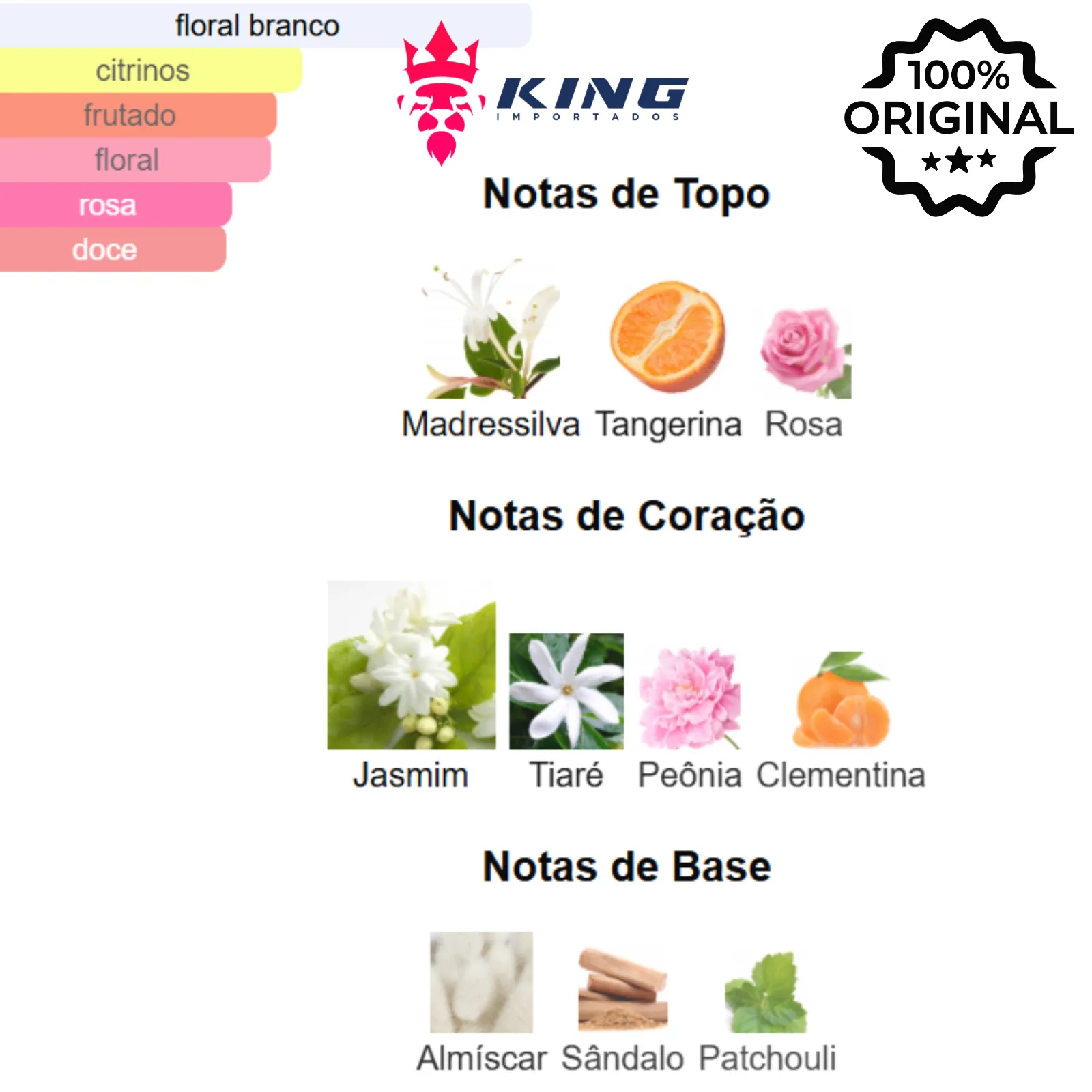Notas de Coração: Jasmim, 🌸 Tiaré, 🌸 Peônia, 🍊 Clementina
