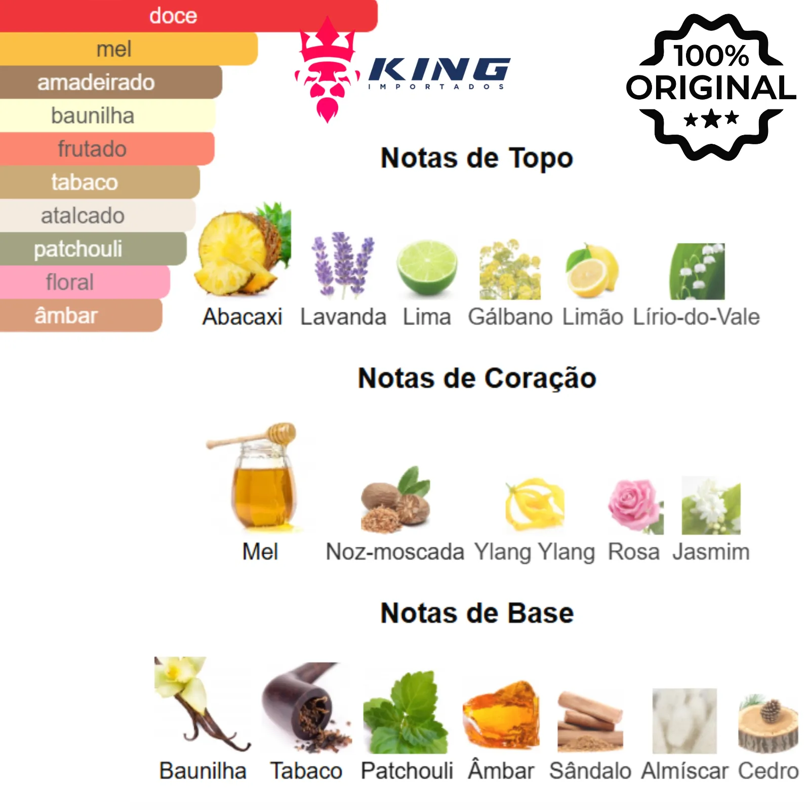 Principais Tipos de Aroma: Oriental Amadeirado, Doce, Especiado, Ambarado, Tabaco.