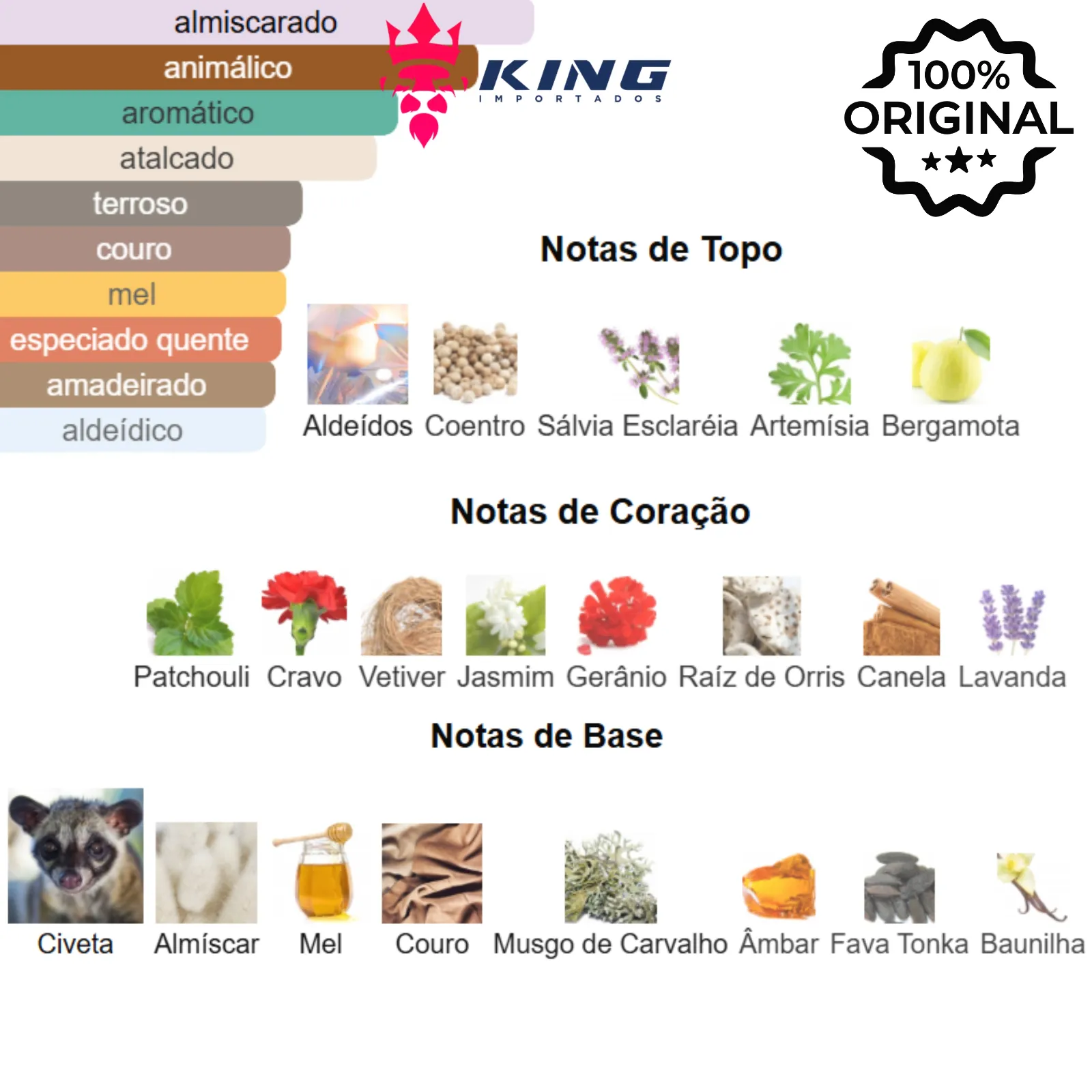 Principais Tipos de Aroma: Aromático Fougère, Amadeirado, Especiado, Animálico, Doce.