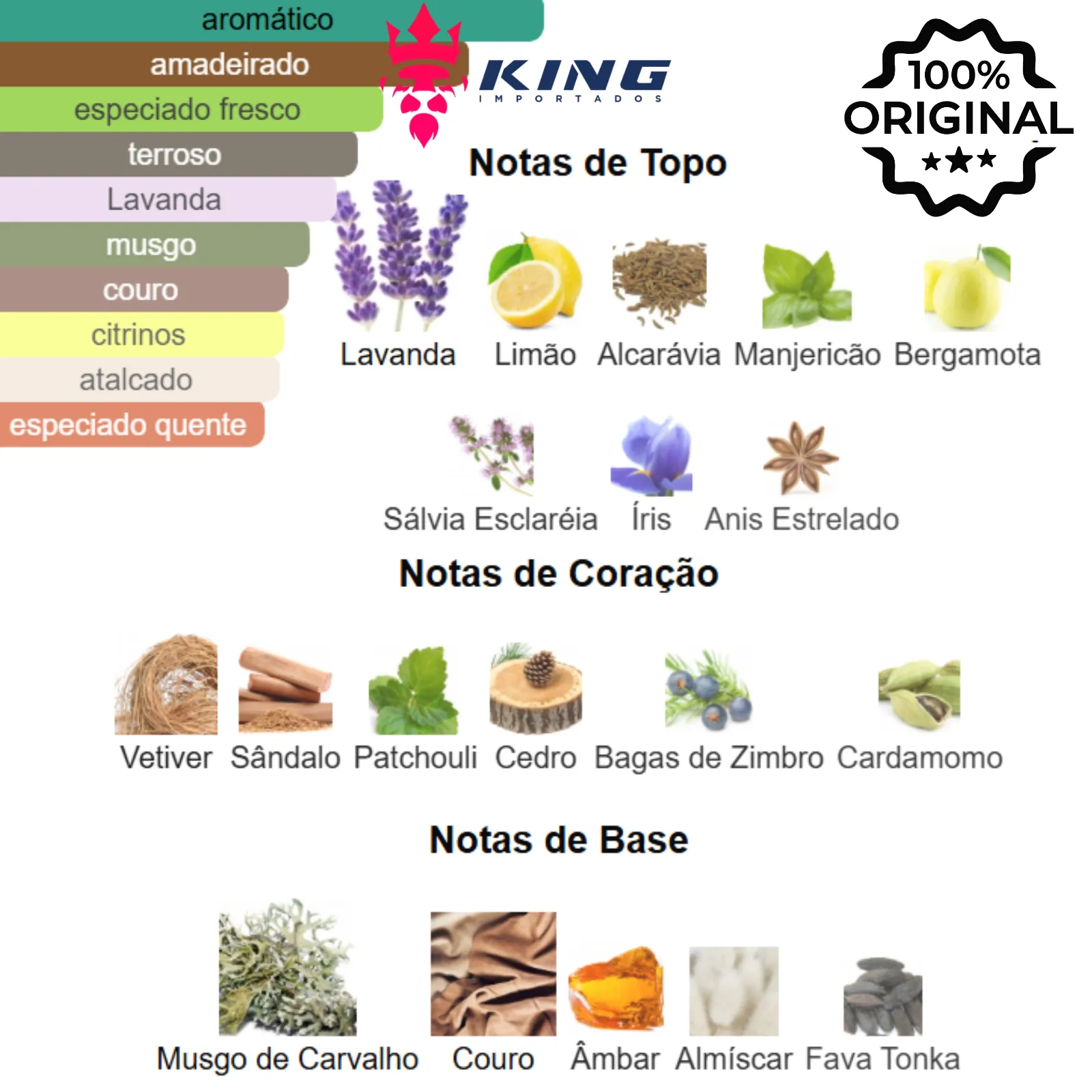 Notas de Topo: [Lavanda], 🍋 Limão, [Alcarávia], 🌱 Manjericão, 🍊 Bergamota, [Sálvia Esclaréia], [Íris], [Anis Estrelado]