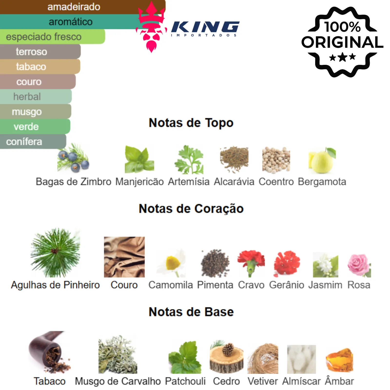 Principais Tipos de Aroma: Chipre Amadeirado, Aromático, Verde, Especiado, Tabaco.
